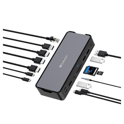 Verbatim USB-C Pro Docking Station CDS-15: 15 Ports - 32171  Overview CDS-15: 2 x HDMI | DP | RJ45 | USB-A 3.1 | 2 x USB-A 3.0 | USB-A 2.0 | 2 x USB-C® 3.1 | SD | microSD |...View more