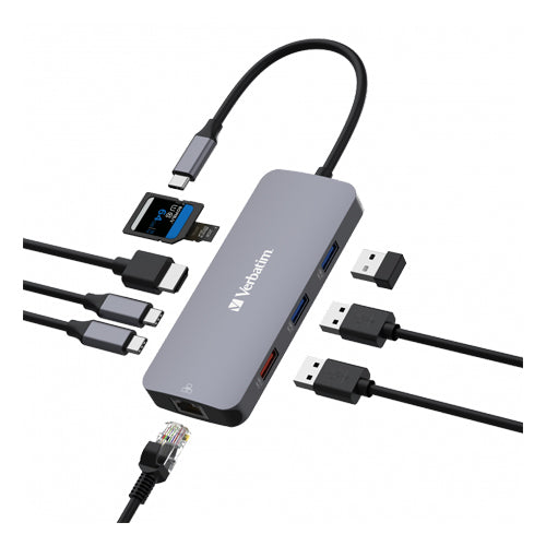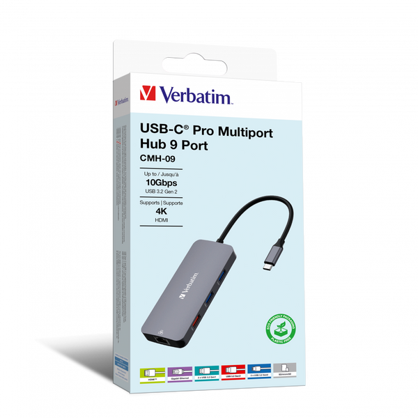 Verbatim USB-C Pro Multiport Hub CMH-09: 9 Ports - 32152 Overview CMH-09: HDMI | RJ45 | 2 x USB-C® | USB-A 3.2 Gen2 |2 x USB-A 3.2 Gen1 | SD | microSD Unleash enhanced connectivity The Verbatim USB-C® Pro 9-Port...View more