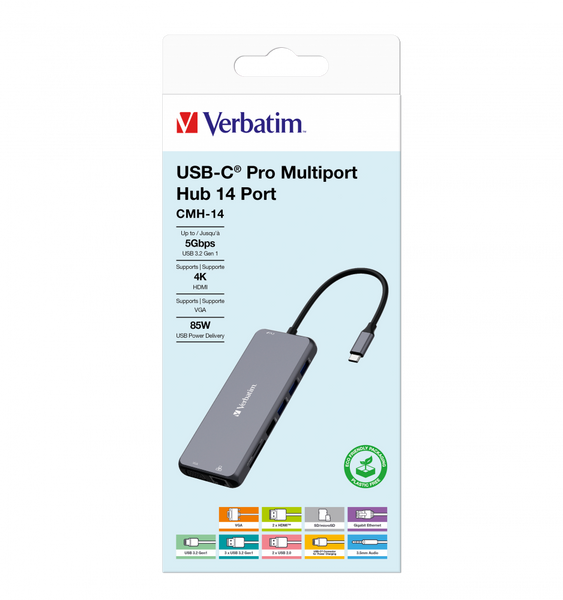 Verbatim USB-C Pro Multiport Hub CMH-14: 14 Ports - 32154  Overview CMH-14: 2 x HDMI | VGA | RJ45 | 3 x USB-A 3.2 Gen1 | USB-C® 3.2 Gen1 | 2 x USB-A 2.0 | SD | microSD | Audio...View more