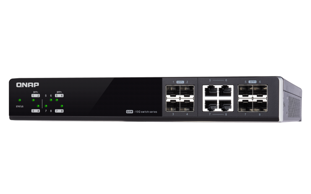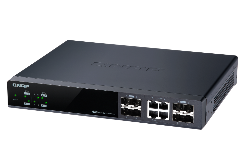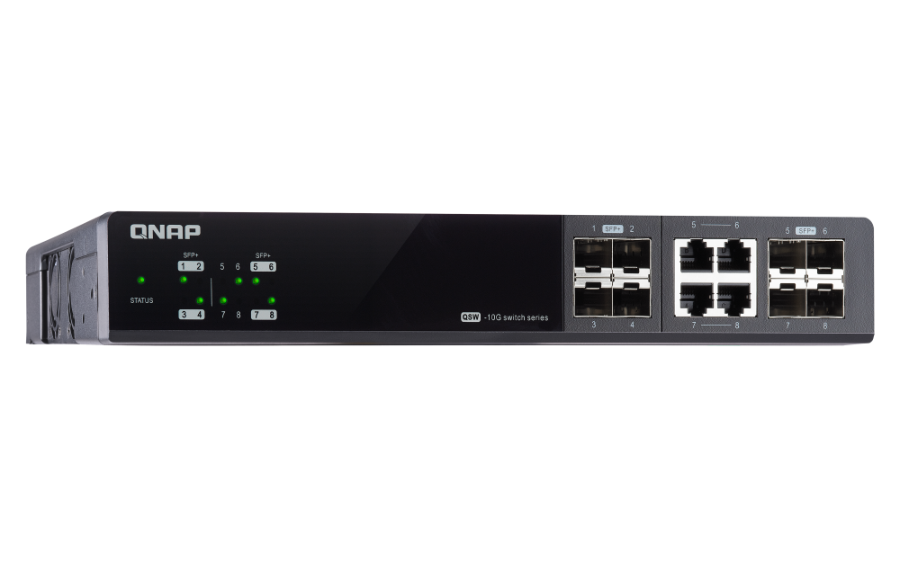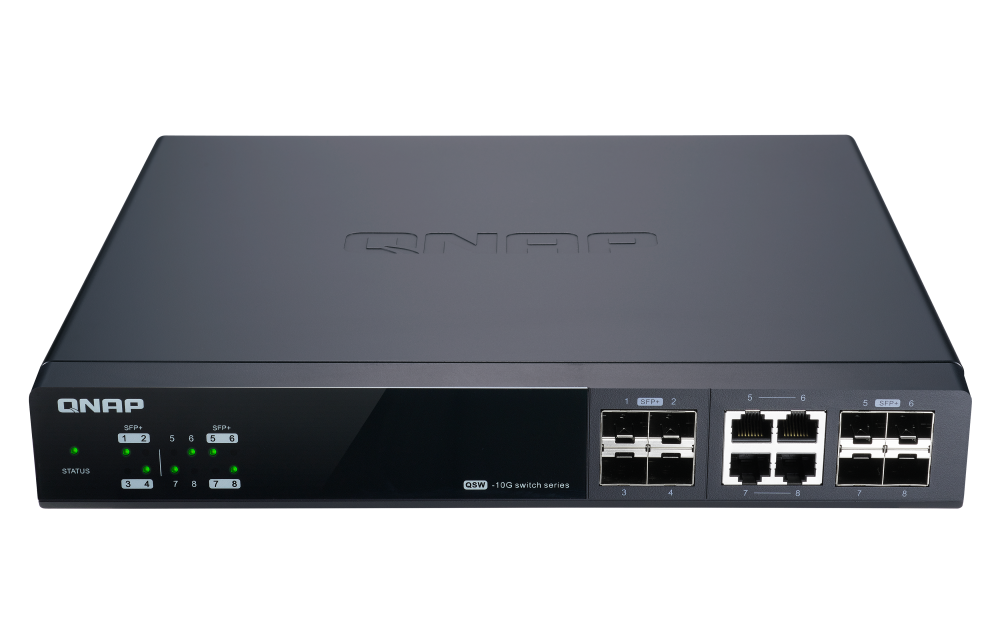QNAP QSW-M804-4C Networking Switch Key Features 4 x 10GbE SFP+Ports 4 x 10GbE SFP+/RJ45 Combo Ports 80 Gb/s Total Non-Blocking Throughput 160 Gb/s Switching Capacity MAC Address Table: 32,000 1 x RS-232 Console Connector 40mm Cooling Fan LED Indicators Mounting...View more