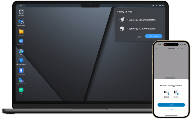 Synology TC500 5MP Outdoor Network Turret Camera with Night Vision - TC500 Camera TC500 AI-powered turret camera Versatile AI camera for securing any location Versatile AI camera for securing any location Consistent clear footage, 24/7 Enhance your surveillance with camera-based...View more