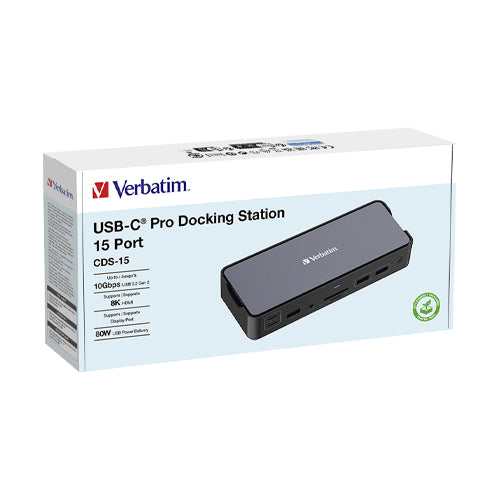 Verbatim USB-C Pro Docking Station CDS-15: 15 Ports - 32171  Overview CDS-15: 2 x HDMI | DP | RJ45 | USB-A 3.1 | 2 x USB-A 3.0 | USB-A 2.0 | 2 x USB-C® 3.1 | SD | microSD |...View more