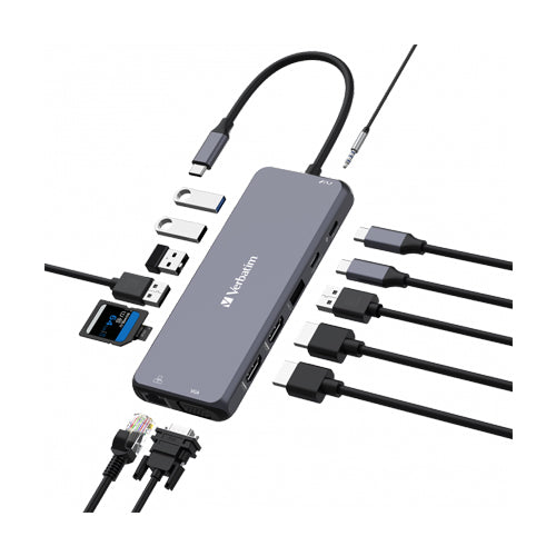 Verbatim USB-C Pro Multiport Hub CMH-14: 14 Ports - 32154  Overview CMH-14: 2 x HDMI | VGA | RJ45 | 3 x USB-A 3.2 Gen1 | USB-C® 3.2 Gen1 | 2 x USB-A 2.0 | SD | microSD | Audio...View more